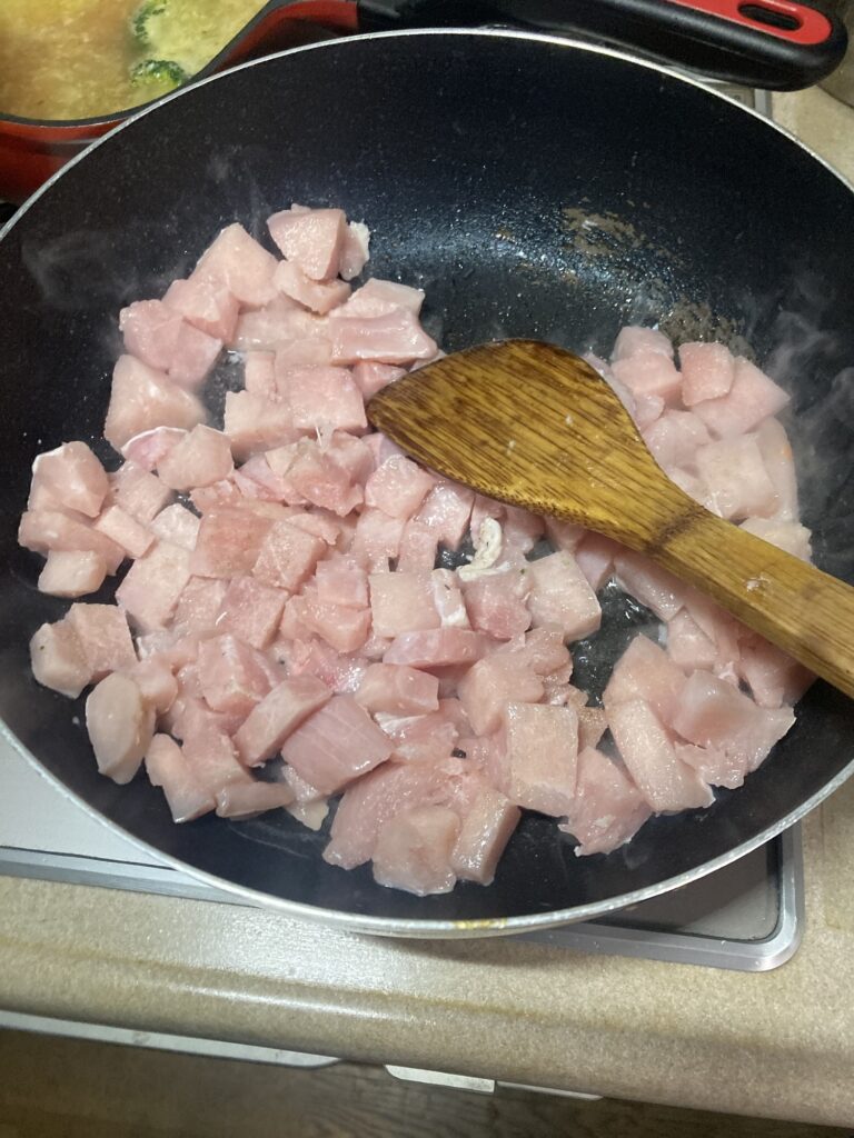 フライパンにオリーブオイルを入れて温めたらよぉ、鶏胸肉を炒めて塩コショウを軽く振るちゃ。色が変わったら取り出しておくがよ。