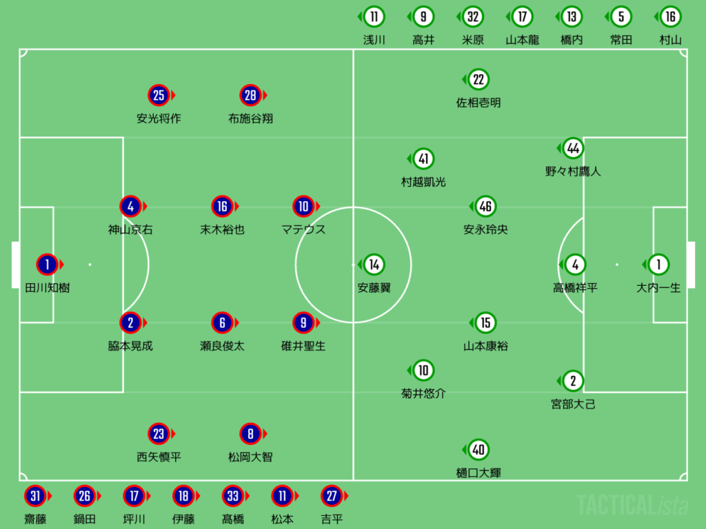 ただ、カターレは井上直輝がベンチ外になっとって、キャプテンの吉平翼が戻ってきとるちゃ。