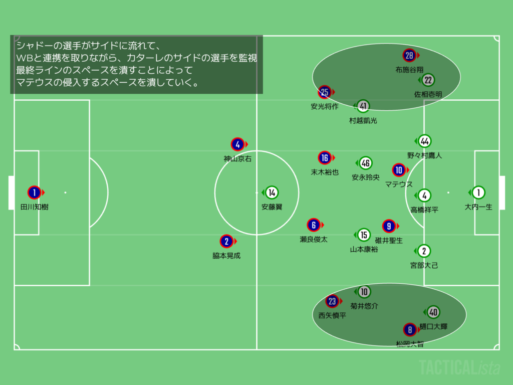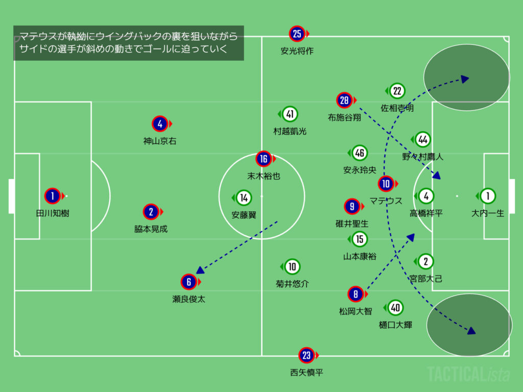 マテウスをサイドの裏に走らせて、サイドの選手が中央を狙っていくという、最近のカターレが得意としているパターンやけど、これは前半の立ち上がりから結構見せていたがやね。