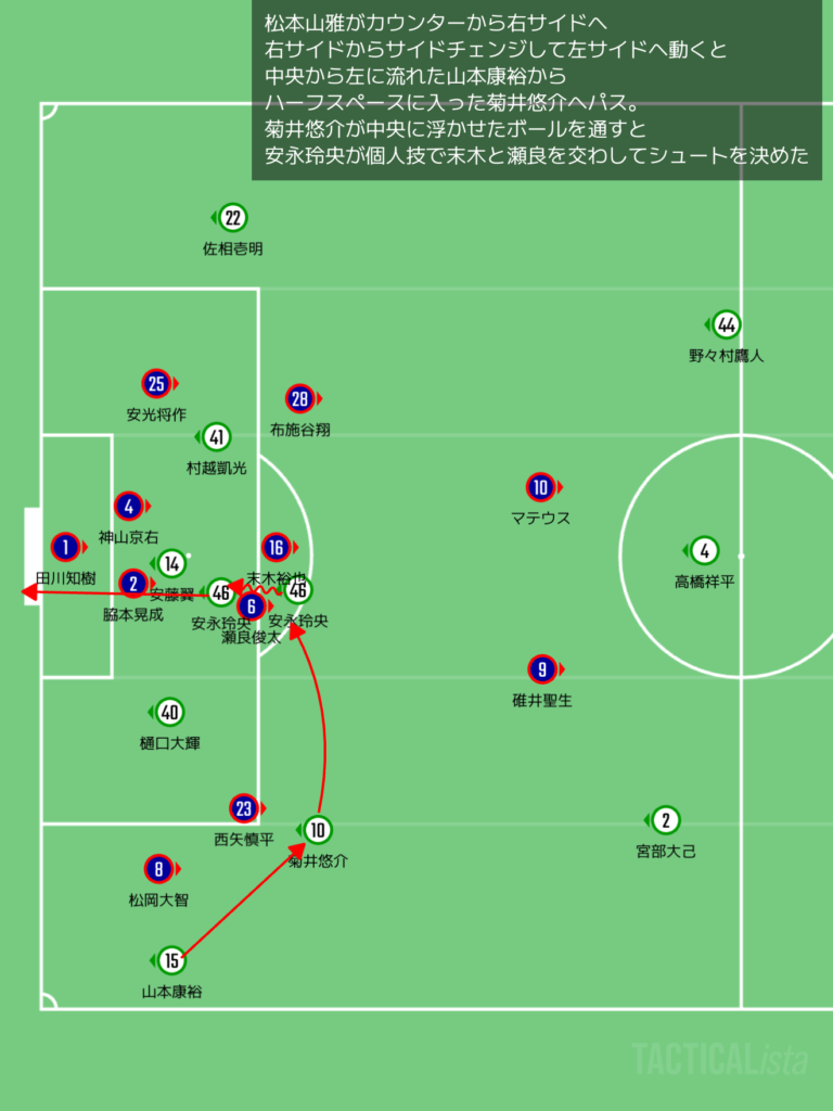 立ち上がりはこれと言って動きがなかった松本山雅やったがやけど、カウンターからミドルゾーンでボールを持てるようになってきたらよぉ、右サイドから長短のパスで横に揺さぶってくるちゃ。そんで山本康裕が左サイドへ流れたところから、菊井悠介が溜めを作って中央に折り返すと、最後は安永玲央が個人技からシュートを決めて、松本山雅が先制点を決めたがやね。