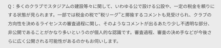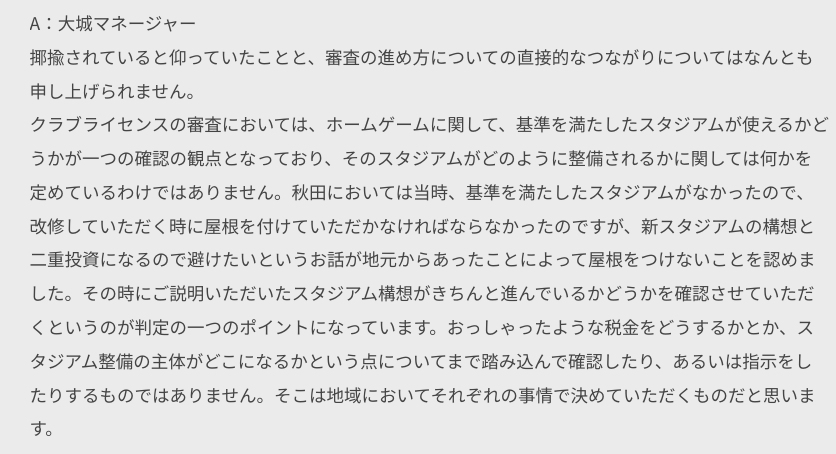 大城マネージャーは「クラブライセンスに適したスタジアムが整備できるかどうかを観点としていて、税金をどうするとか、スタジアム整備の主体がどこになるかを指示するものではない」と粛々と答えとらっしゃったのう。