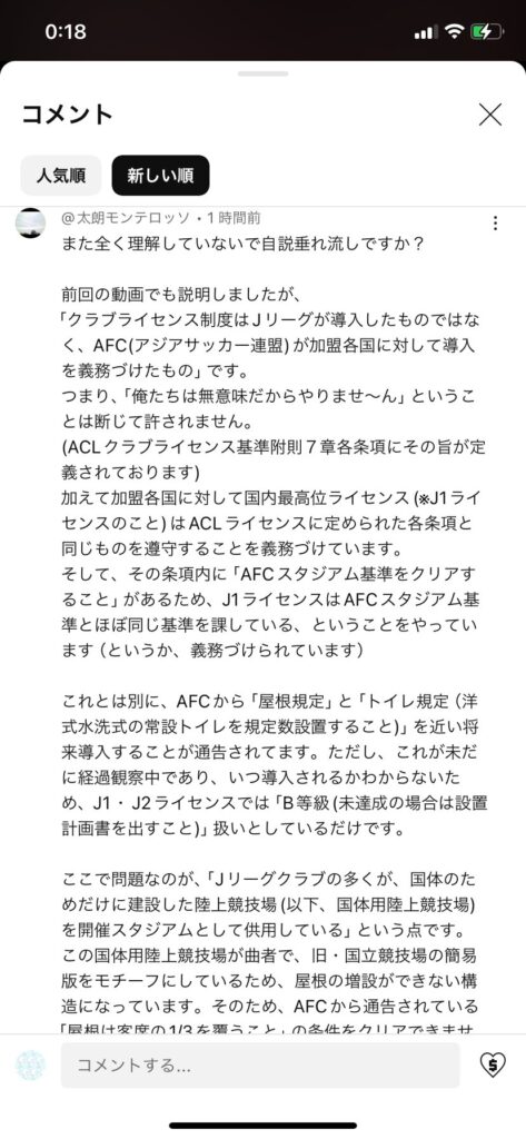 太郎モンテロッソさんがJリーグはAFCのライセンスに規制されると主張する→誰かがAFCのライセンスに関する原文を掲示する→AFCがしているのが「推奨」であると確認される→太郎モンテロッソさんのコメントがツリーもろとも消える(→消えたコメントのスクショXに貼られる)という事が複数回ありました