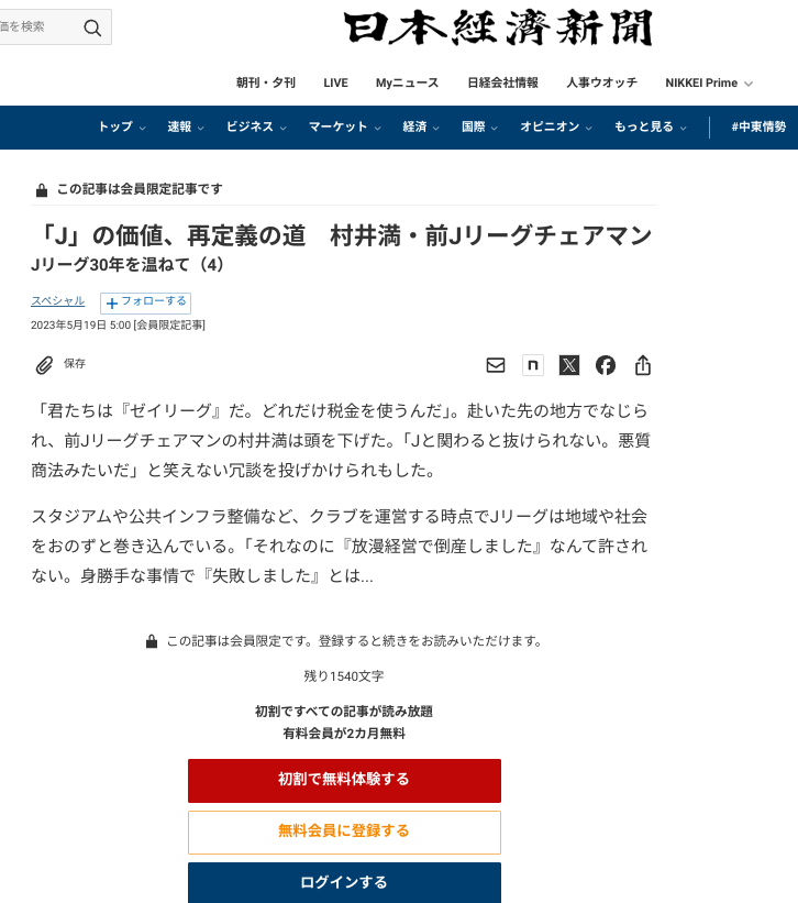 ただ、こういったものは、本来なら全文を読んで判断するべきやちゃ。なぜならタイトルが「「J」の価値、再定義の道 村井満・前Jリーグチェアマン」であり、冒頭にある「ゼイリーグ」を語るものとは考えづらいちゃ。それによぉ、全文をきっちり読んだ上で判断しとかんと、何よりもライターさんに失礼やちゃ。ということで、会員登録して読んでみたじゃ。