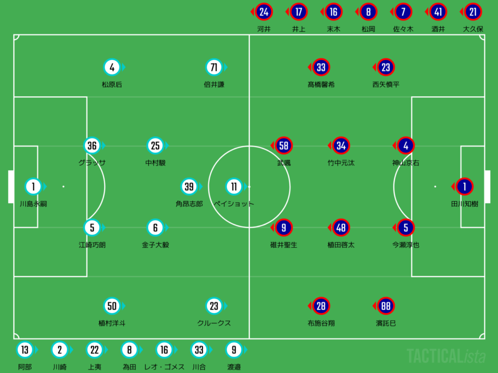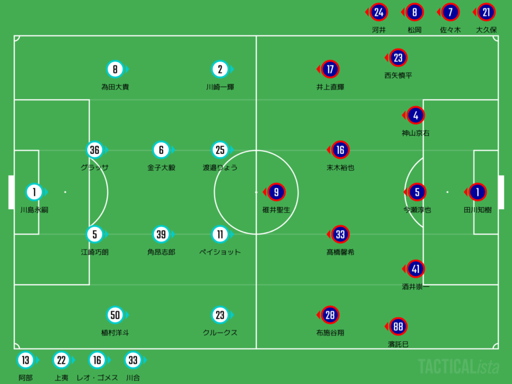 運動量が落ちていた松田力と伊藤拓巳を下げて、碓井聖生と布施谷翔を起用するちゃ。