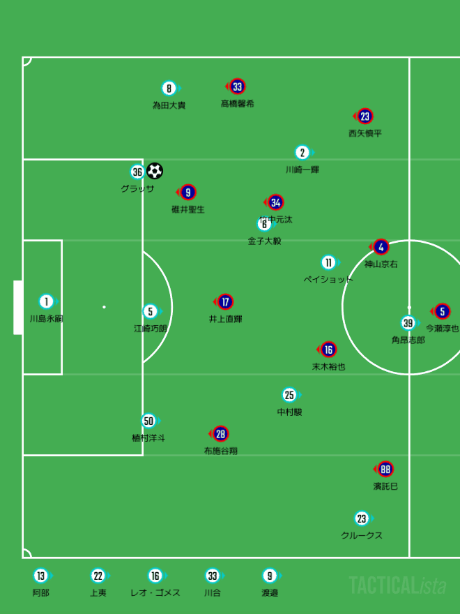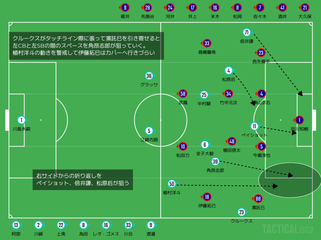 クルークスへの対応に集中する濱託巳が引っ張られるところによぉ、スペースが生じるところを角昂志郎がどんどん侵入していったがやね。カターレとしては伊藤拓巳がカバーに回っていきたいところやったがやけど、基本的に対面の植村洋斗についていくのが主なタスクやったがで、どうしてもフリーになる局面があって、そこから2回決定機作られとるちゃ。相手が外してくれたから助かったがやけど、あんまし良くない展開やったのう。