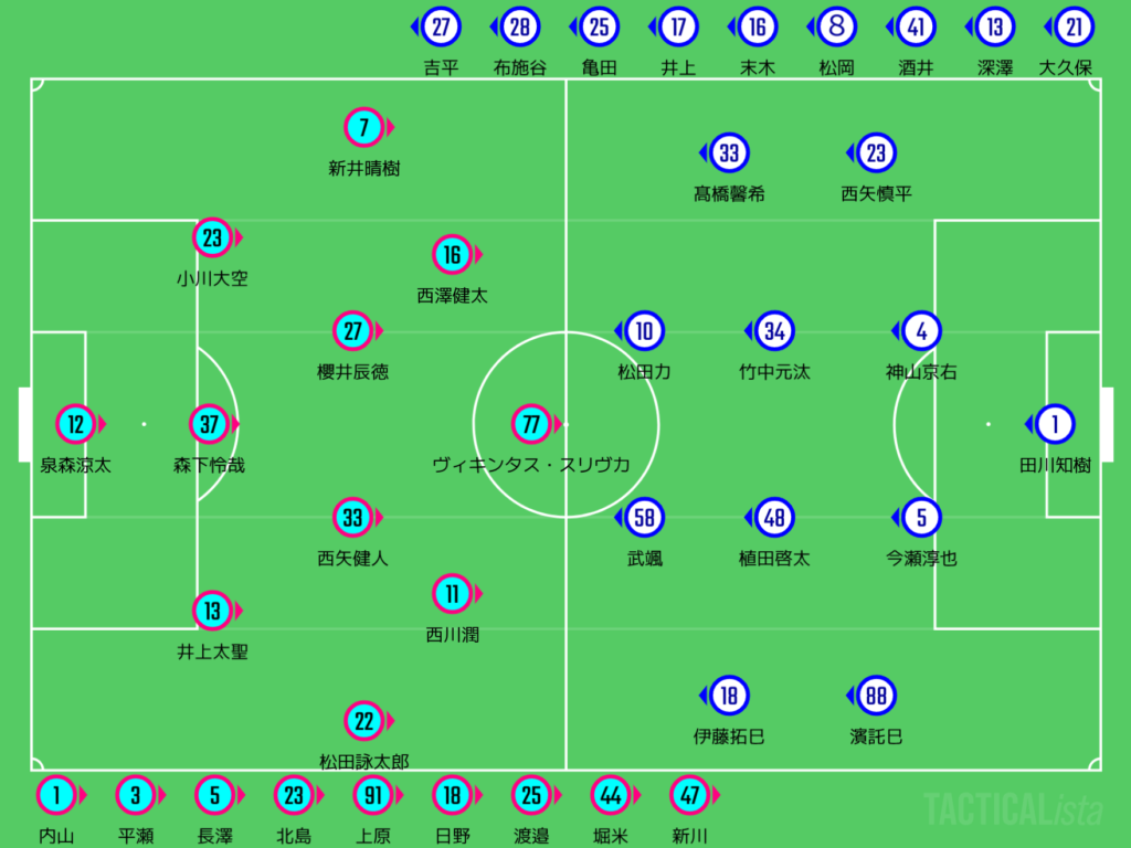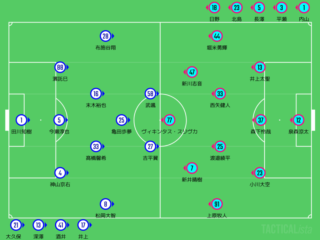 亀田歩夢はトップ下の位置に入って、細かなタッチから狭いところを積極的に侵入していったじゃ。亀田の細やかなタッチと左サイドから突いていく布施谷翔のコンビネーションから、中央突破を図っていったじゃ。ATに入って、シュート1本、ファールを1回もらって、終盤の攻撃を活性化させていたじゃ。