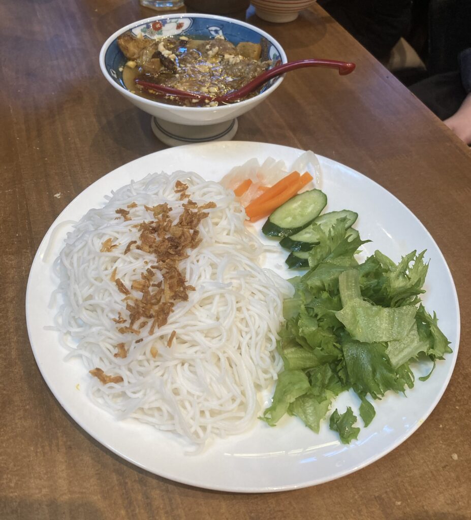 ベトナム料理の麺類といえば、平たい麺の「フォー」が有名やけど、これは「ブン」という丸型の麺やちゃ。これはフォーと違って、つけ麺スタイルで食べる麺料理ながいちゃ。