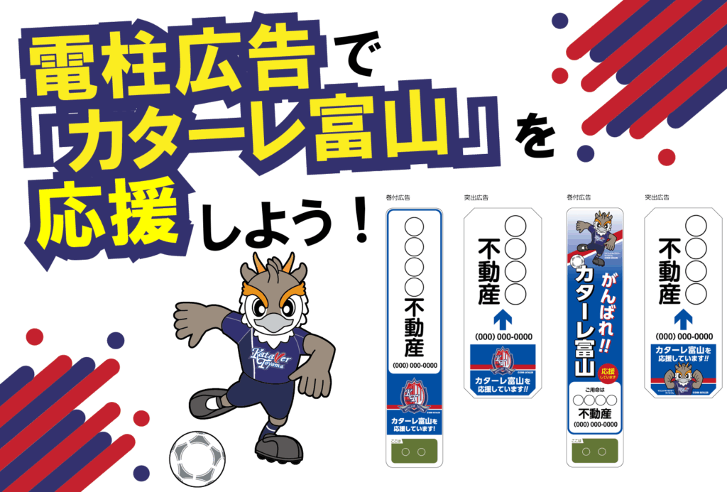 北電産業株式会社による「電柱広告でカターレ応援企画」がスター... このたび、カターレ富山では、北電産業株式会社より電柱広告を活用した「カターレ富山」応援企画を実施いただくこととなりましたので、下記の通りお知らせいたします。 街...