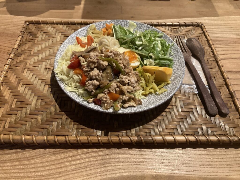 地場産の野菜がふんだんに使われてよぉ、季節に合わせたハーブが盛られているガパオライスやちゃ。タイ料理ながで、一見辛そうなイメージがあるがやけど、こちらのガパオライスは全然辛くないがで、辛いのが苦手な人には安心して食べられるちゃ。味付けはであっさり目で健康的やちゃね。鶏肉がほろほろしとって、野菜はシャキシャキしとって、ハーブとジャスミンライスの香りが心地よくて、くどさを感じさせない清涼感のあるガパオライスやったじゃ。