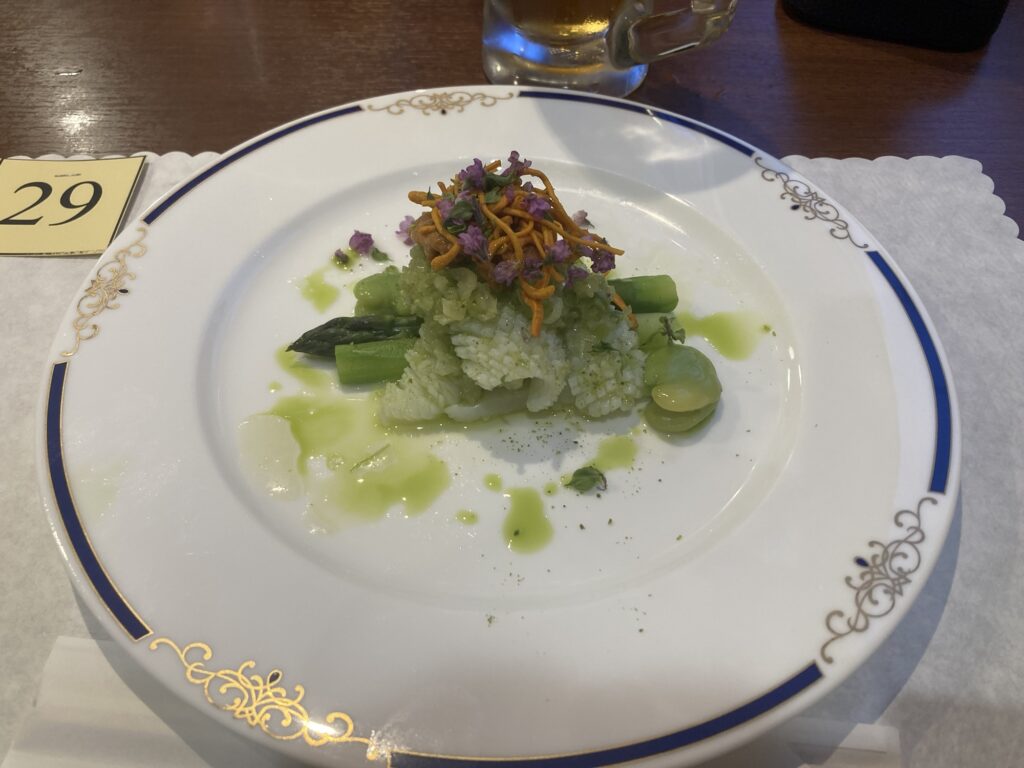 前菜の「アオリイカ・ウニ・アスパラの山椒和え」やちゃ