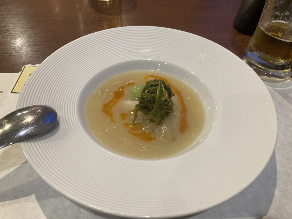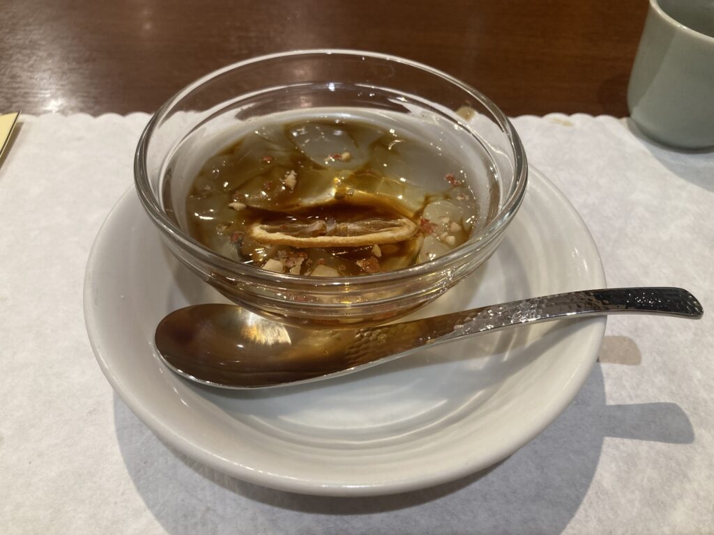 フカヒレのゼラチン質の食感とツルッとした感じをよぉ、スーラーソースをかけ合わせたものになっとるちゃ。ピリッとした辛さがアクセントになっとるのう。