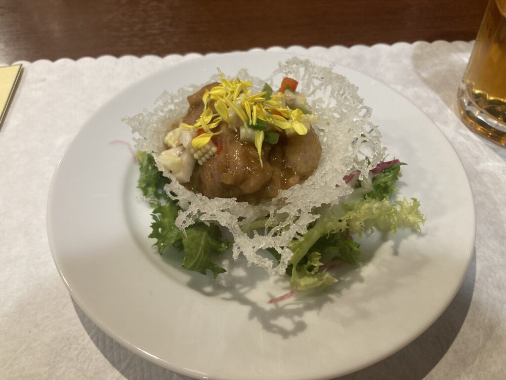 アスパラの上にアオリイカとウニが乗っている前菜ながよ。この緑と海鮮が入っている感じは、四川っぽくない気はするところやけど、食べてみると四川特有のスパイスである山椒のバチッとした痺れがアクセントになっとるちゃね。アオリイカ特有の海鮮の臭みを残しつつも、舌触りのツルッとした食感が良くてよぉ、ウニの濃厚さ、アスパラのみずみずしさのコントラストがたまらんちゃ。