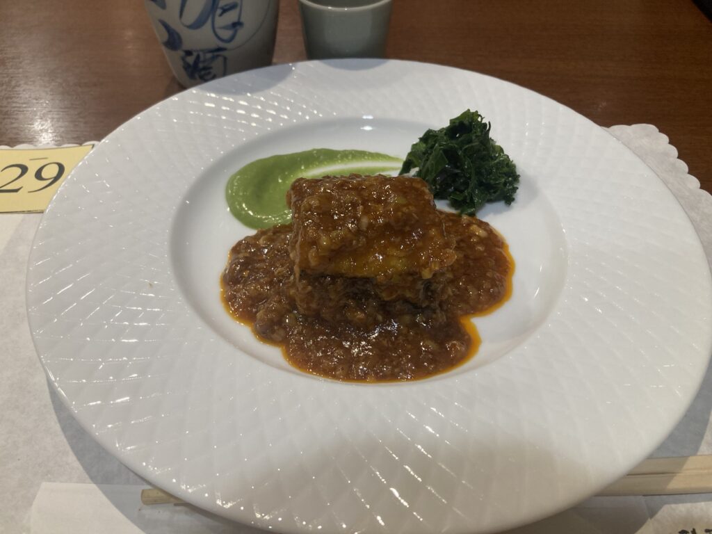 外側はカリッとしていて、中は茄子の瑞々しさがあって、この食感がたまらんちゃ。麻婆ソースも茄子に合わせてアレンジされたもんやし、この緑色のソースをかけあわせると味変が楽しめてたまらんがよ。庶民的なマーボー茄子がここまで上品な料理に昇華されているとは驚かされたじゃ…。さすが陳ファミリー伝統のマーボー茄子やちゃ。
