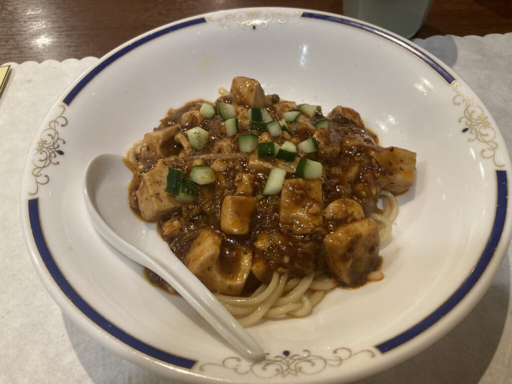 四川飯店伝統の麻婆豆腐やちゃ。今回は麺と一緒にいただくようになっとるちゃ。