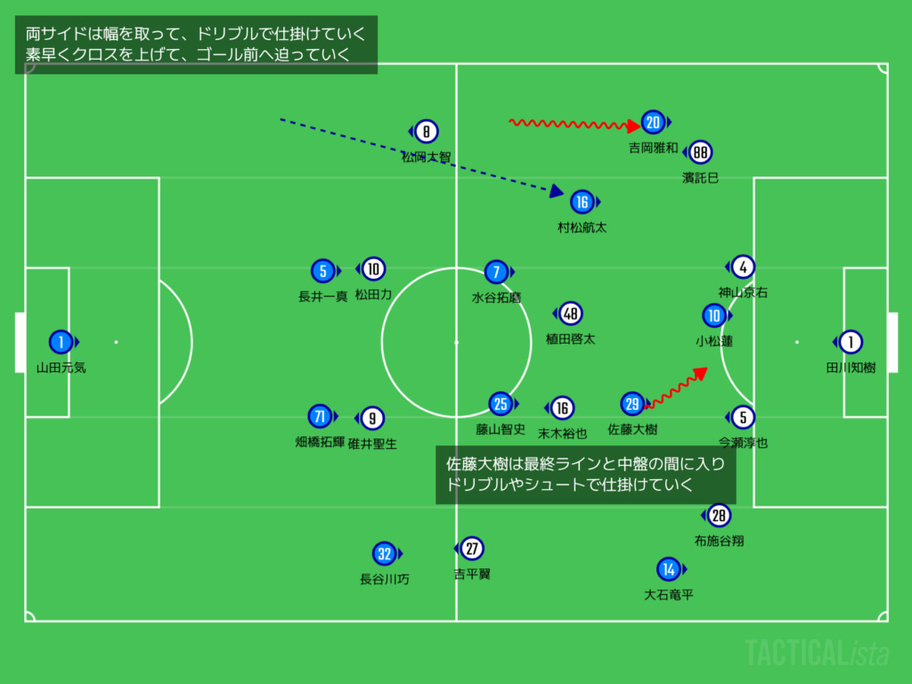 FWの鈴木翔大と右SHの石田凌太郎を下げて、大石竜平と元カターレの吉岡雅和を起用してきたじゃ。左サイドに入っていた佐藤大樹がFWになって、両サイドに大石と吉岡が入ったじゃ。