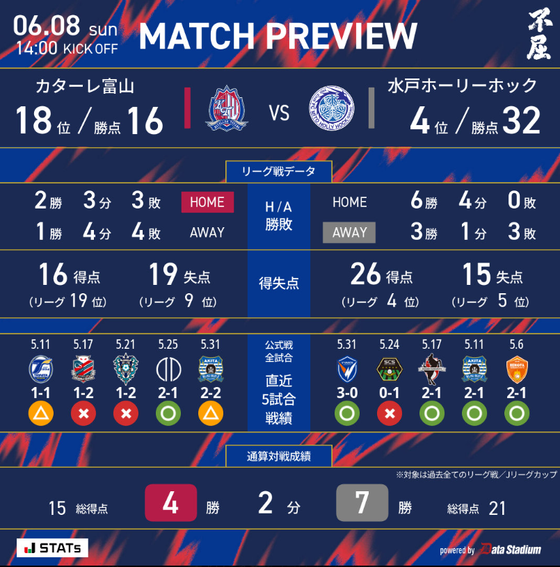 過去の対戦成績はカターレの4勝、水戸の7勝、引き分けが2試合ながよ。かつてのJ2時代では苦戦を強いられていたカターレにとっては、まだ勝てていた方の相手ではあるちゃ。