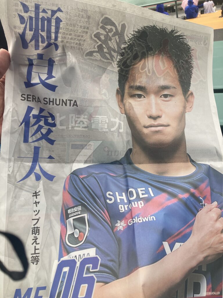 今日は北日本新聞サンクスデーということで、入場者全員に号外が配られていたがよ。号外の表面はよぉ、選手の顔が入ったものが出ていて、選手・監督全員分が用意されとったがやね。