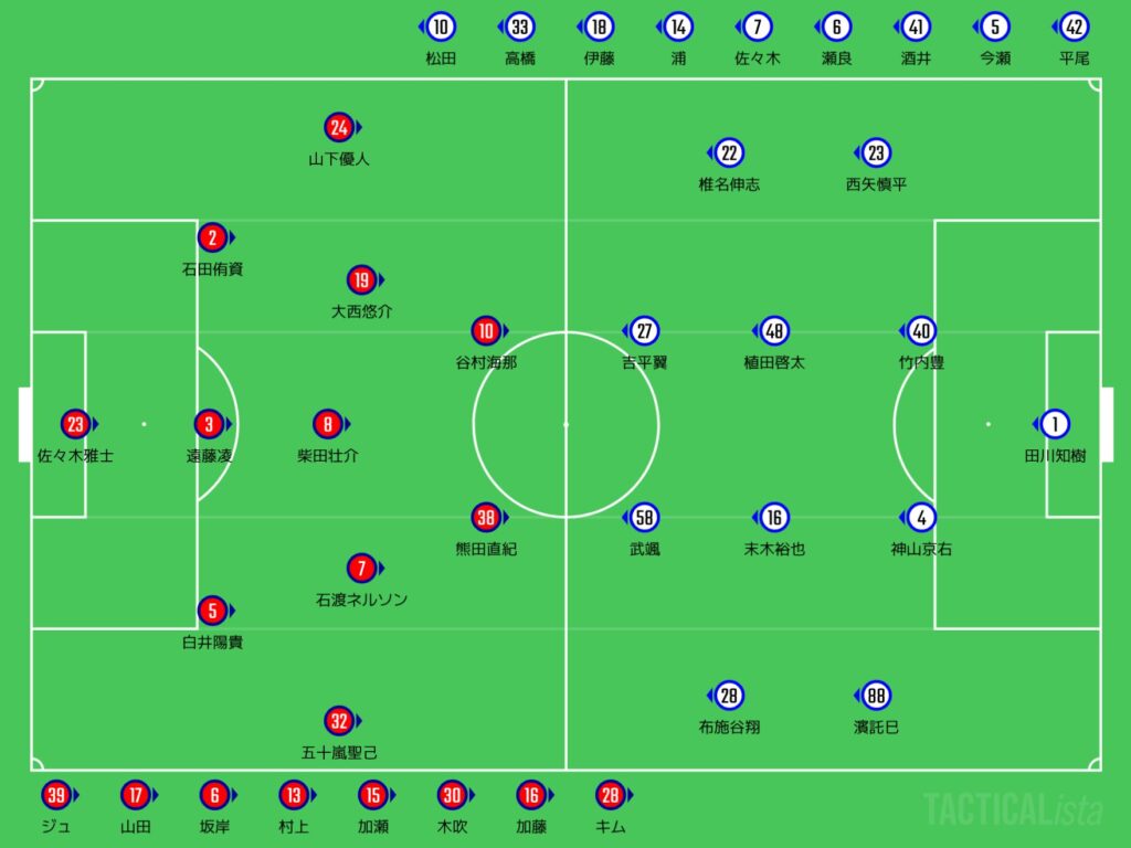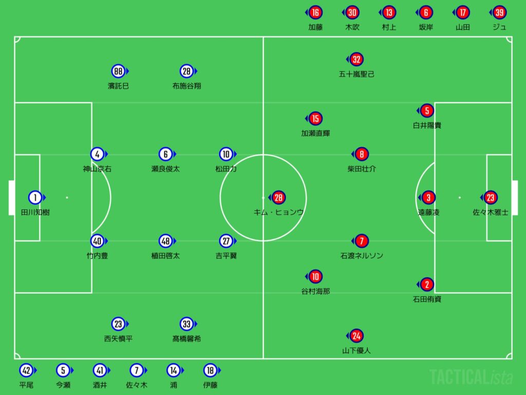 前節で吉田新が全治6週間の怪我を負ったがで、左SBは濱託巳、右SBは西矢慎平が入っとるがよ。中盤はサイドが代わってて、右が椎名伸志、左が布施谷翔やちゃ。FWは吉平翼と武颯の2トップやちゃね。
