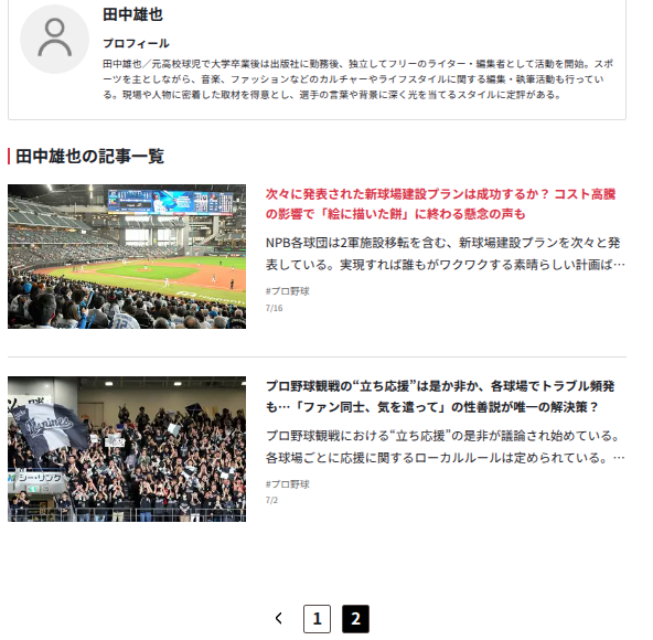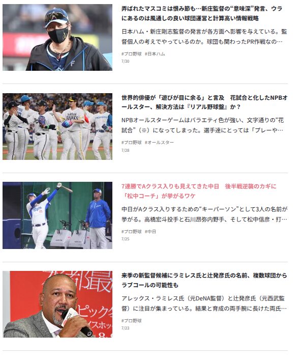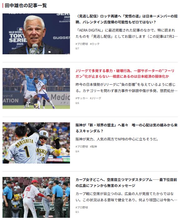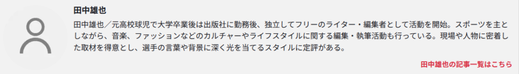 「スポーツ以外には音楽やファッション」とか書いてあるがに、実際やっとることは野球だけながやねぇ…。多彩なライフスタイルに適しとるようにプロフィールで書いてあるがやけど、過去記事を見る限り、どう見ても「野球専門ライター」にしか見えんちゃ。