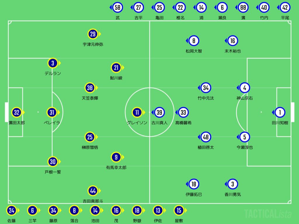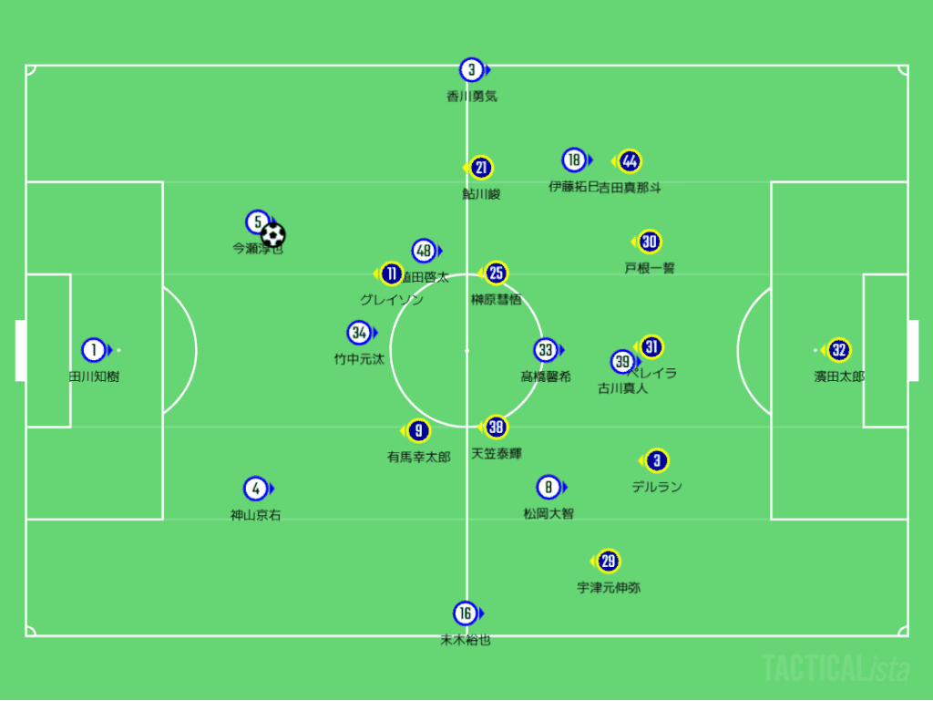 大分がグレイソンにボールを集めて、2列目がボールを回収して攻撃を継続していく展開で、カターレはボールをつなぎながら左サイドを中心に攻めていく展開やったじゃ。カターレはグレイソンへの対応に手を焼いたがやけど、なんとかボールを回収して攻撃に転じられる展開になっとったじゃ。