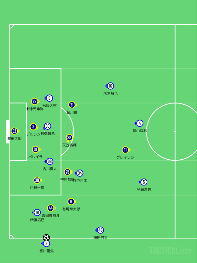前節は香川勇気からのクロスをゴールにできんかったがやけど、幸先よく決められるのは良かったじゃ。それも決めたのがファーサイドにいた松岡大智というのがいいのう。ナイスゴールやちゃ!
