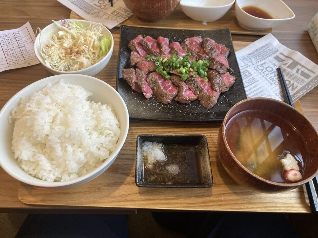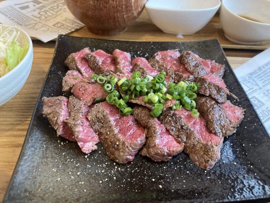 口の中でとろけてよぉ、弾力のある食感がたまらんちゃ。おろしポン酢との相性が本当によくて、これだけで本当にご飯が進むちゃ。ジューシーでとろっとろな和牛の素材をそのまんまで提供しとるのがいいちゃね。