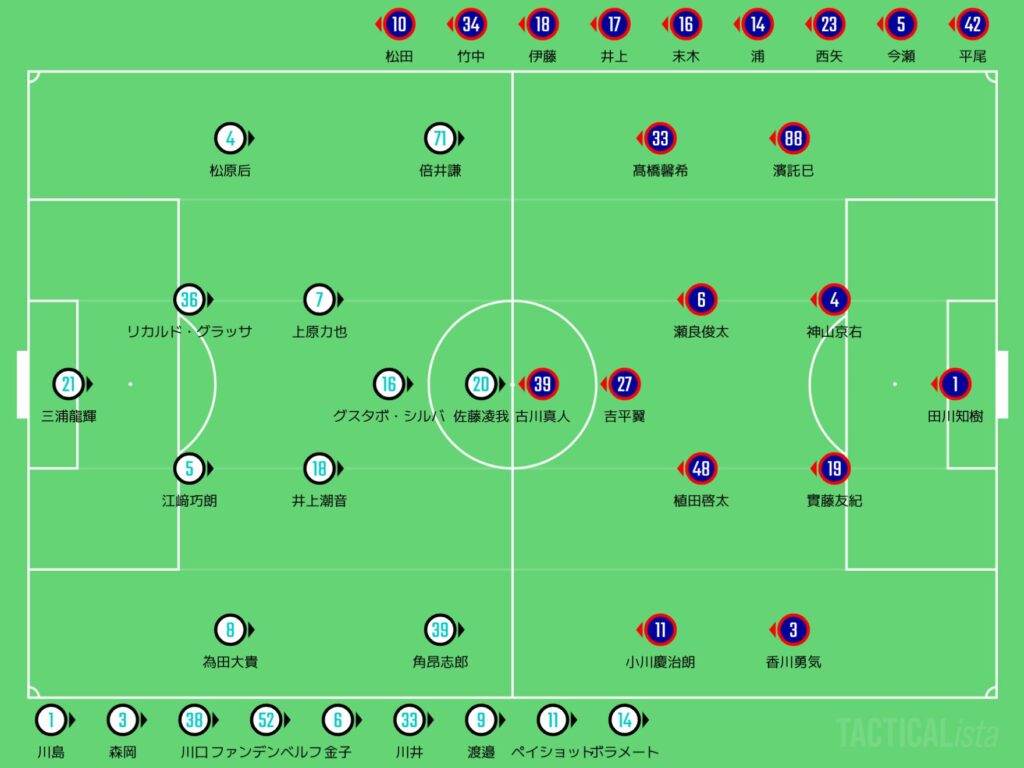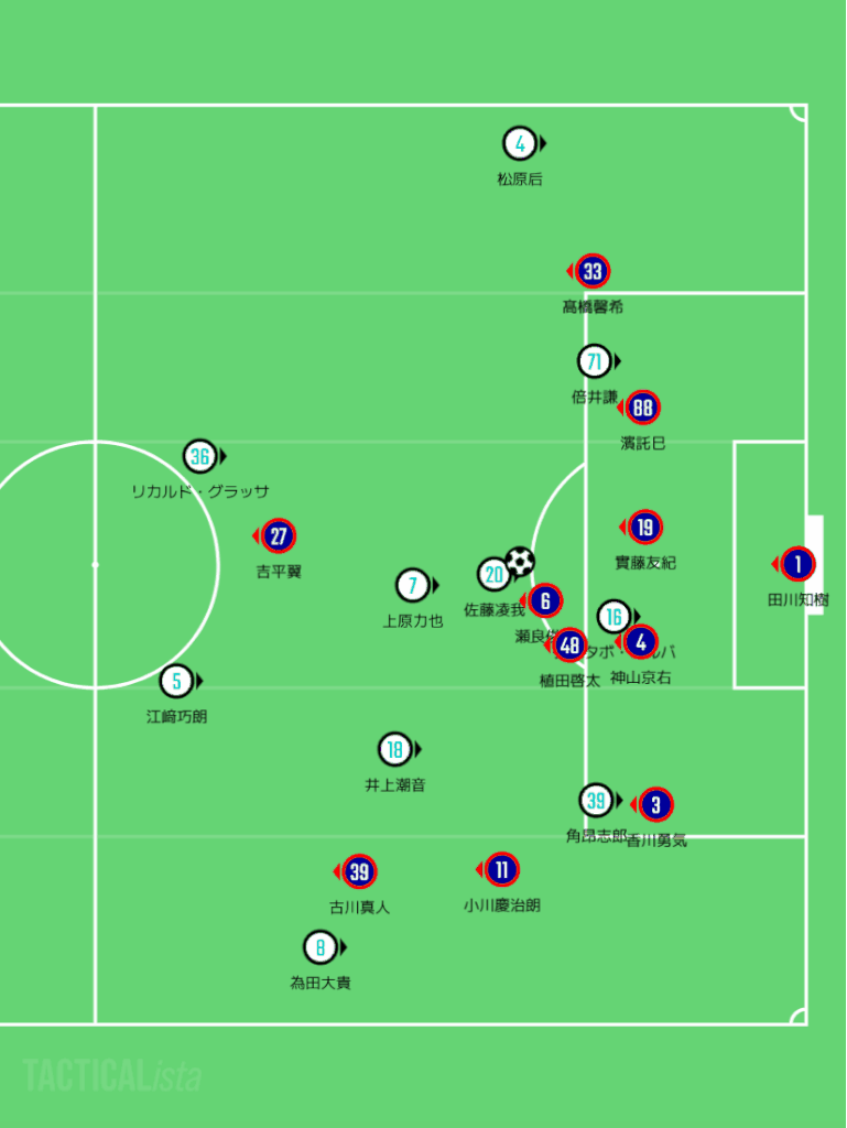 あと、實藤のとこのマークもそうやけど、上原力也が完全に前を向ける状態になってしまっているのが間違いやろう。最終ラインに吸収されるようなポジションを取っていた植田啓太か、もしくはトップ下に入っていた吉平翼がプレスバックするなりで、前を向けない状態にしとったら、ラストパスを入れさせないで済んだと言えるやろう。