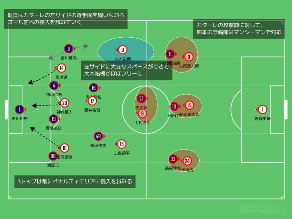 まず、塩浜遼のポジショニングが非常にやらしくて、香川勇気と他の選手の間のポジションを徹底的に狙っていて、そこを起点にしながら仕掛けようとしとったがいちゃ。カターレとしては香川勇気はビルドアップの起点となる選手だけに、上手く使っていきたいところやったがやけど、逆に熊本が香川のところを狙い目として定めていたがやね。
