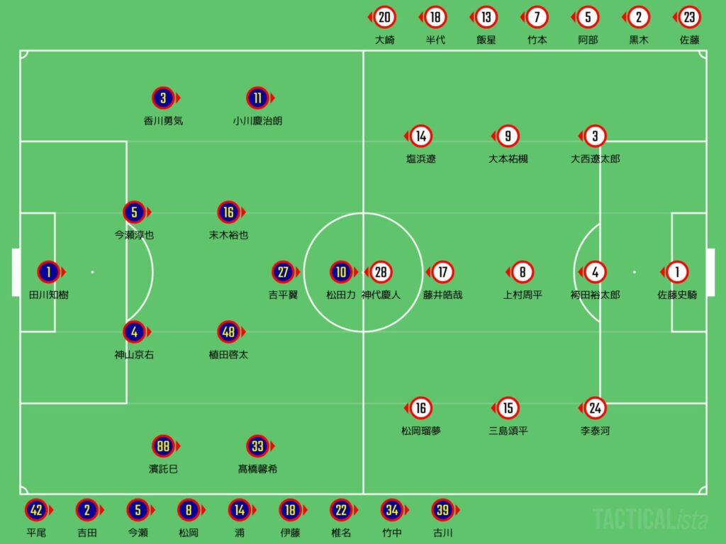 カターレのスタメンやけど、前節と変わったところは、中盤が末木裕也と植田啓太のコンビになって、FWが松田力と吉平翼の2トップになっとるちゃ。前節スタメンやった瀬良俊太はベンチ外になっとるのう。