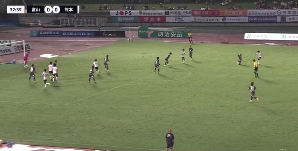 開始10分くらいはカターレが攻める時間があったがやけど、10分以降は熊本のペースでずーっと試合が進んでいくことになったじゃ。熊本が優勢になった局面はこんな感じやちゃ。