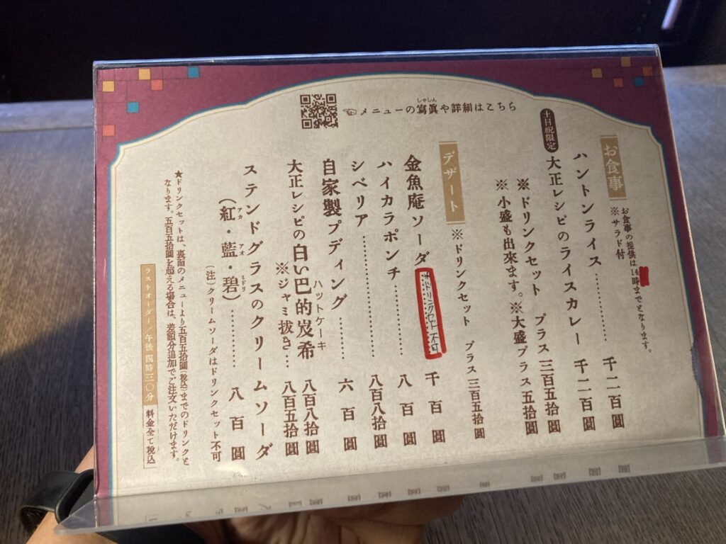 | 食事メニューの提供時間 | ~14:00(以降はドリンクなどメニュー限定) (kingyoan.jp) |