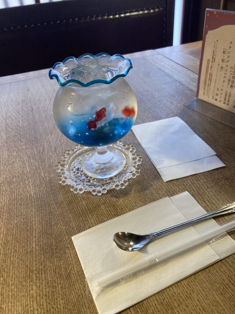 金魚鉢の形をしたグラスの中によぉ、ゼリーとソーダが入ったスイーツやちゃ。夏場限定のスイーツで見ているだけで清涼感が漂ってきて、涼しい気持ちになるちゃ。