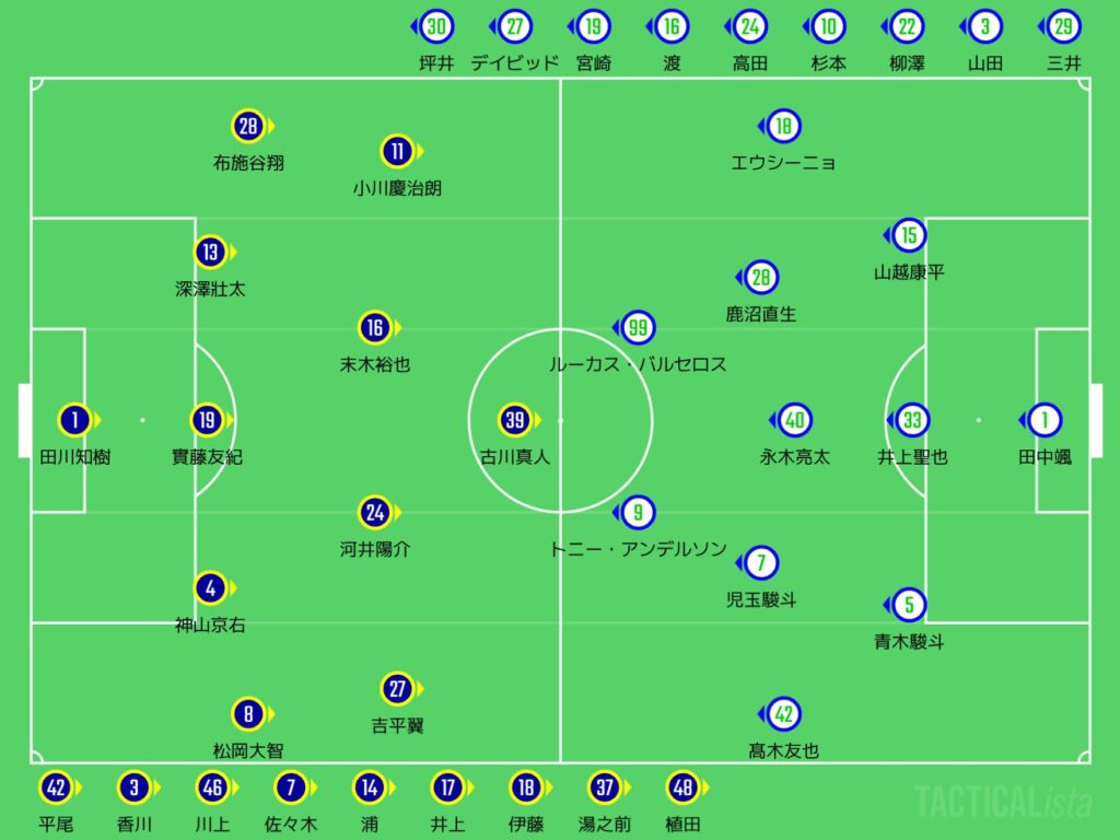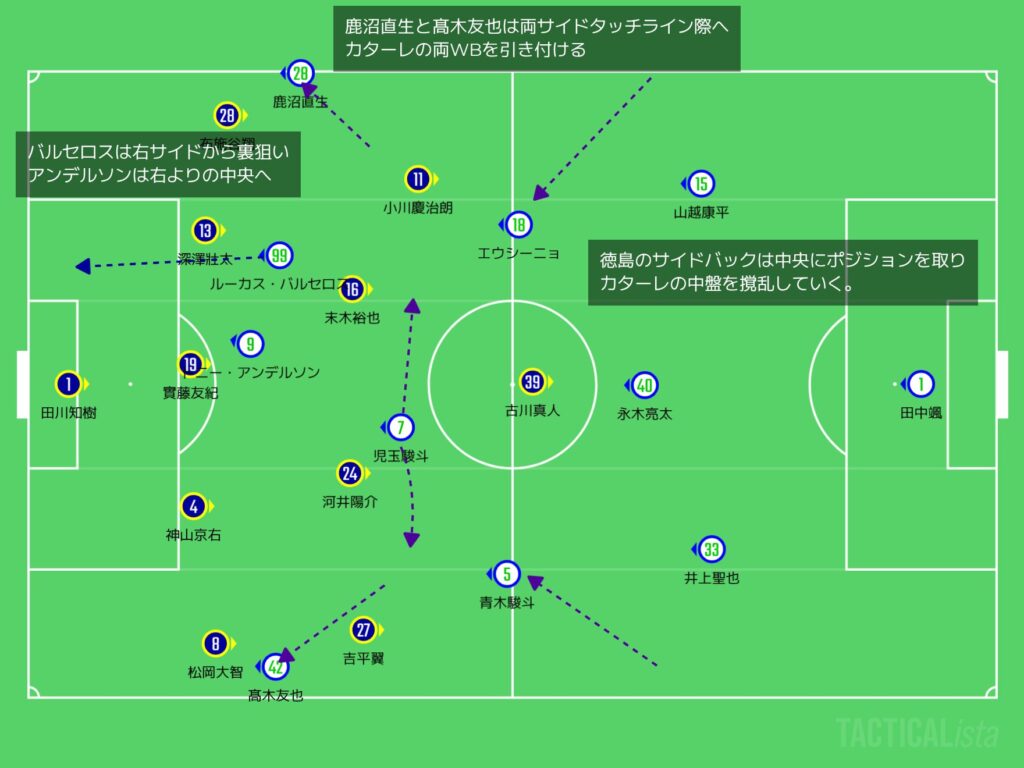 根本的には「トニー・アンデルソン、ルーカス・バルセロスのブラジル人2トップにいかにゴールを決めさせるのか?」というところがテーマになっとるがやけど、カターレの5バックを攻略するために、各選手の配置を流動的に動かしていたのう。