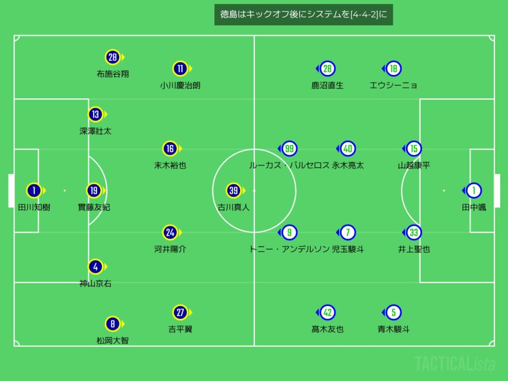 ほとんど3バックでプレーしていた徳島やったがやけど、この試合は変則的な4バックで戦っていたじゃ。中盤でプレーしている鹿沼は右サイドに張って、エウシーニョと右サイドを組み、左は青木駿斗と髙木友也が組んでいたじゃ。
