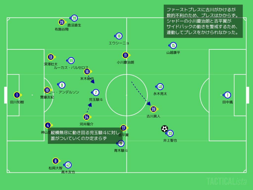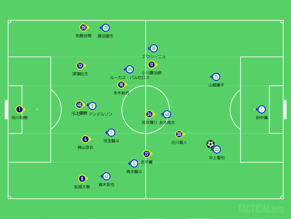 サイドハーフに起用されている髙木友也、鹿沼直生の2人やけど、彼らは徹底してタッチライン際にポジションを取っていたがやね。ビルドアップ時は永木亮太が最終ラインに下がって、山越康平と井上聖也とともに3人で展開していって、サイドの職人的な選手であるエウシーニョと青木駿斗の2人は、守備時はサイドに守りつつ、攻撃時にはハーフスペースに侵入して、児玉駿斗と共に中盤の経由地になっていたじゃ。