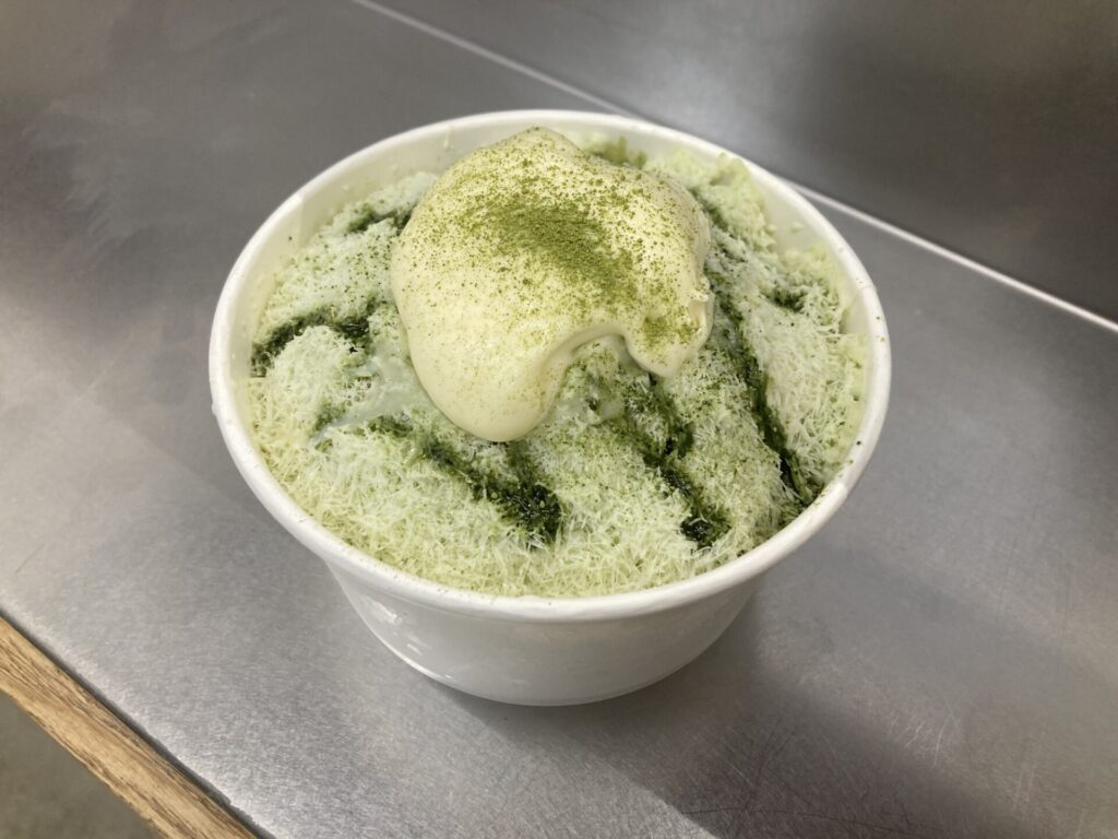 日本のかき氷は氷らしいシャリシャリ感が残ってよぉ、キーンとするような感じなのが特徴的やけどよぉ、韓国のかき氷は極細に砕かれているがでよぉ、フワッフワながいちゃね。氷を食べているというよりも、パウダースノーを食べているような感覚に近いやろう。スプーンで掬って見てもよぉ、えらい軽い感じながよ。滑らかな舌触りがいいちゃね。