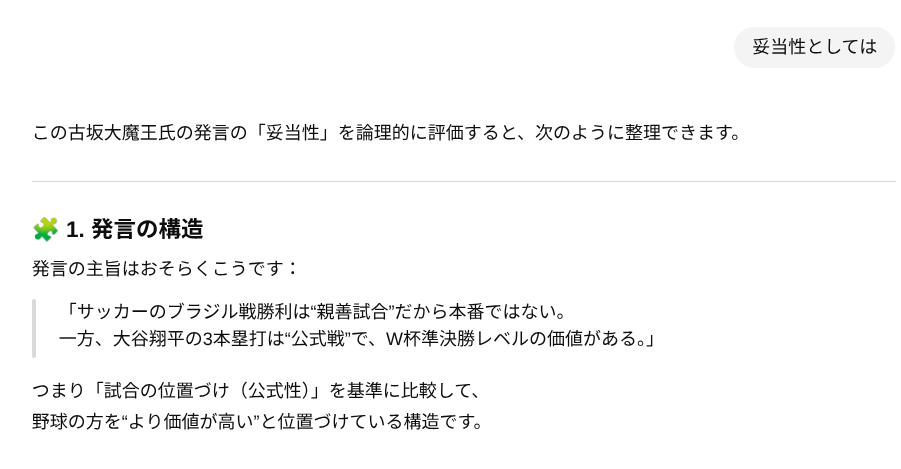 | ② 個人戦績とチーム勝利を同列に扱えるか | ❌ 妥当でない | 大谷のHR3本は個人のパフォーマンス、ブラジル戦の勝利はチームの成果。評価軸が異なる。 |