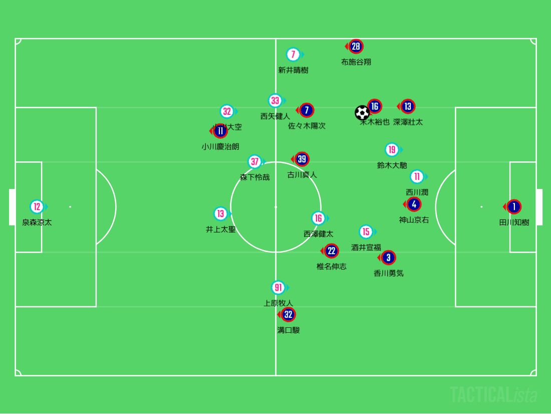 ゴールの質としてもちろん素晴らしいことに変わりないがやけど、相手に選手を上手く動かしながらよぉ、右サイドで張り付かせるような局面を作った後に、左サイドから速攻を仕掛けるというパターンながで、いわば「疑似カウンター」という感じやちゃ。随所に末木裕也が顔を出してよぉ、相手の守備をずたずたにしとるのは見事やのう。