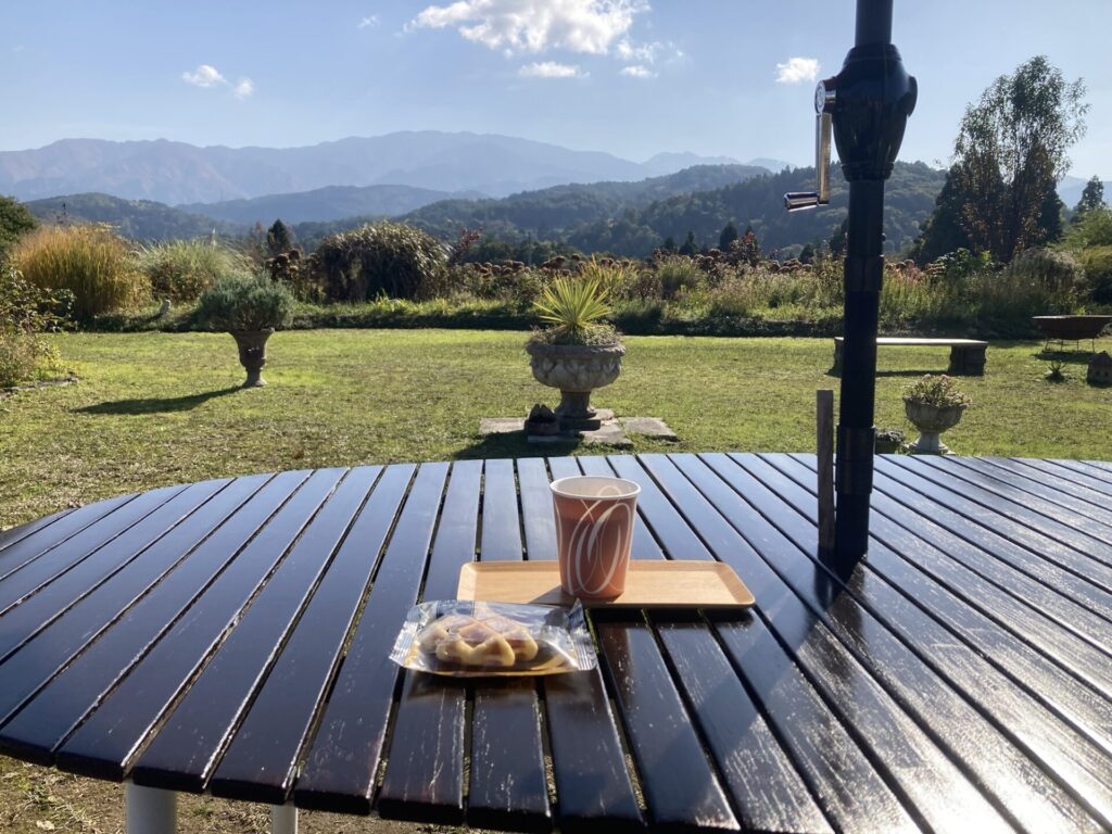 山を眺めながらよぉ、なーんにも考えることなく、コーヒーとワッフルを愉しむ…。これはたまらんにか。こういう時間が本当に良い感じやちゃね。しばらくスマホさえ離してよぉ、ぼーっとしとるのがいいがやぜぇ。