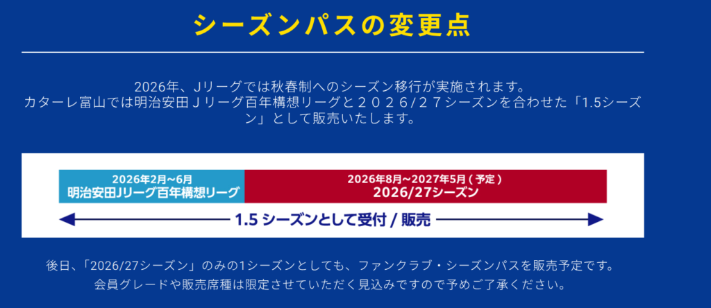 来年はよぉ、シーズンが秋春制になるということで、上半期は特別シーズンとして「百年構想リーグ」というのが約半年間開催するちゃ。ということでよぉ、この百年構想リーグでのシーズンパスの扱いについてよぉ、他のクラブでは「0.5シーズン販売」「来季の26/27シーズンも含めて1.5年分販売」「百年構想リーグではシーズンパスを発行しない」パターンがあったがやけど、カターレは「1.5シーズンとして受付」ということになったじゃ。