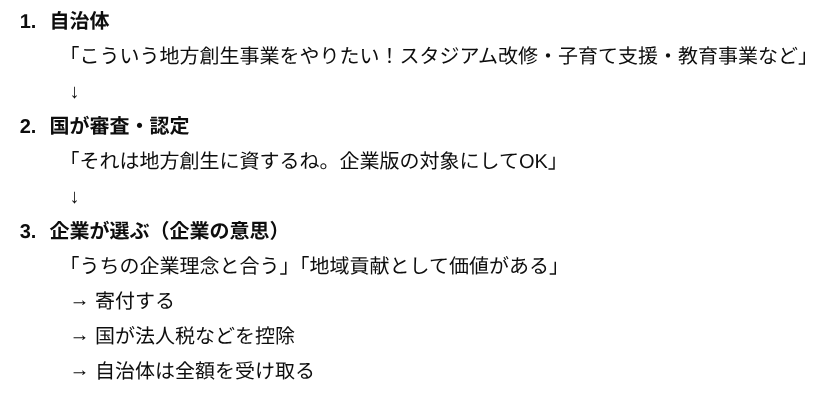 このことから分かることはよぉ、企業版ふるさと納税というのは”自治体×国×企業”の三者が関わる構造やちゃ。
