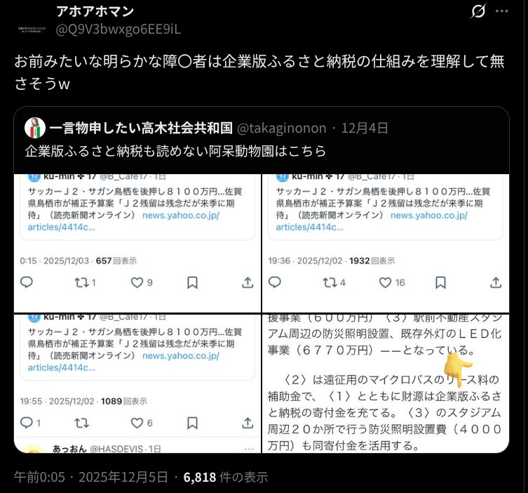 まあ、元々のニュース記事をまともに読まないで、鳥栖市民が収めた税金が原資となっていると思いこんだがでしょう。ちゃーんと記事を読んだら「企業版ふるさと納税」と書いてあるがで、多数のアカウントから「文章読めないやつが群がっている」と突っ込まれとるわけでのう…。