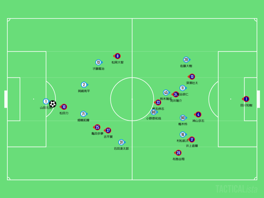 亀田歩夢の魅力が全て出ているゴールやちゃ。一度トップスピードが出たらよぉ、相手が引っ張っても剥がしてしまう強さと、鋭い切り返しで対面のセンターバックを剥がしてしまったり、最後は抜群のコントロールショットで、ビッグセーバーの山田元気も全く動けずゴールに吸い込まれてしまうほどのエクセレントでワンダフォーでクレイジーなゴールで、とてもエキサイティングでエモーショナルなゴールやったじゃ。