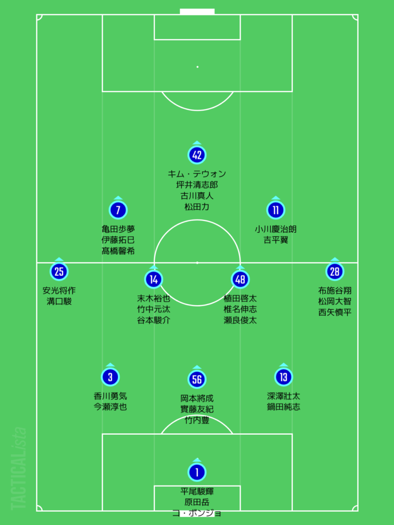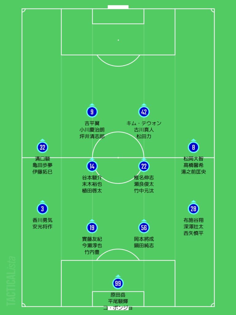 吉平翼、小川慶治朗はサイドハーフでの起用も考えられるやろう。機動力を活かした3人の裏抜けがどこまで効果的に発揮するのか注目やろう。