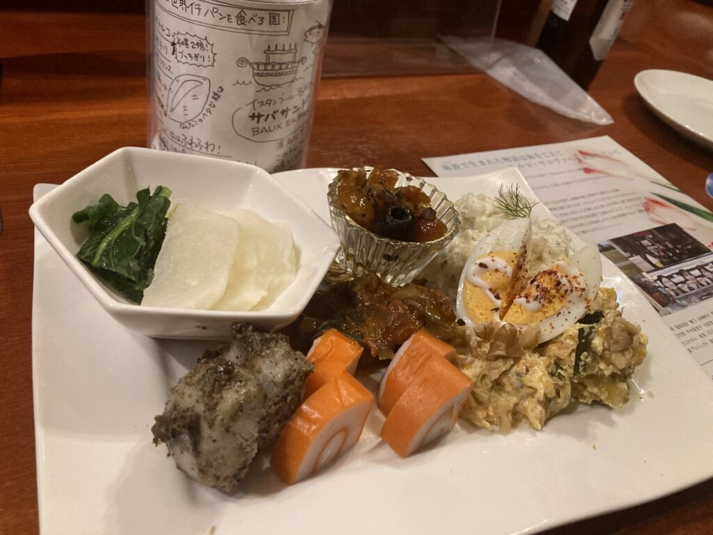 まずは前菜やちゃ。トルコでは「メゼ」と言われるがよ。この盛り合わせを見ると分かるようによぉ、店主さんのこだわりが見えるちゃ。かまぼこが入っているようにトルコと富山の融合やちゃ。「前菜」というとちょっこし構えるような感じになりそうやけど、日本の居酒屋で言う「お通し」みたいなもんやちゃね。真ん中にあるオリーブの酢漬けが強烈に酸っぱかったじゃ。