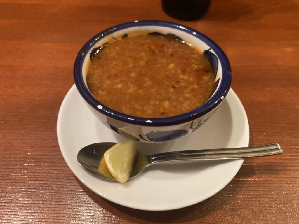 これがトルコのスープ「チョルバ」やちゃ。トルコの家庭料理として一般的なスープながよ。赤レンズ豆、トマト、ひき割り麦、米、ミントが入ったスープでよぉ、トルコの小料理店「ロカンタ」での定番やちゃね。レモンを絞れば味変がするちゃ。これを食べればエキゾチックな気分になって、気分はもうトルコやちゃ。