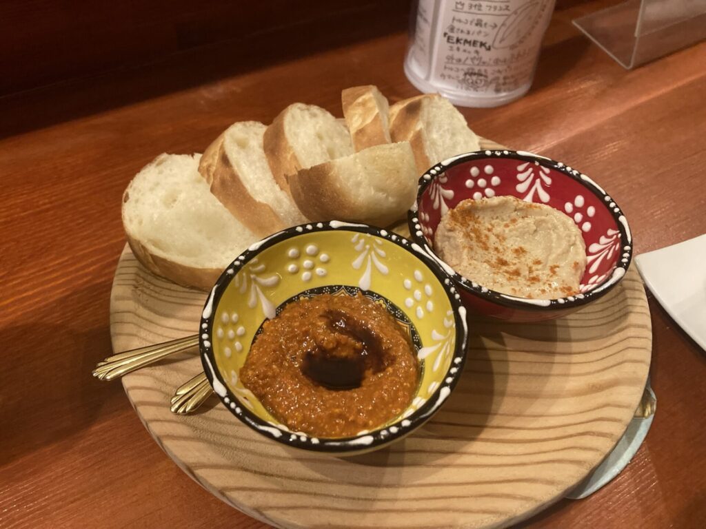 これもロカンタでのおなじみやちゃ。パンとディップの盛り合わせながよ。左はパプリカ、右はフムス(ひよこ豆)やちゃ。これをパンにつけながら食べるがよ。すごくシンプルやけどよぉ、これをつけながら食べるだけで、パンが止まらなくなってしまうちゃ。まさに「パンどろぼう」やちゃね。