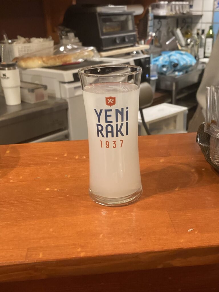 トルコの蒸留酒「ラク」やちゃ。ブドウの蒸留酒に、アニス(八角)の香りを加えたトルコの国民的な蒸留酒やちゃ。アルコール濃度が非常に高くて30〜45度くらいあるがやね。無色透明やけど、ロックや水割りにすると白濁化するのが特徴的やちゃね。