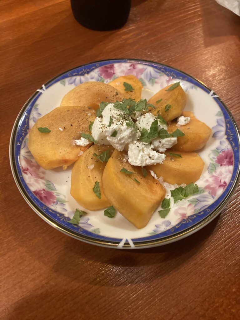 次はトルコチーズと柿ながいちゃ。いつもはイチジクらしいがやけど、ここは日本のお店である「スルタンのおきにいり」やから、日本ならではの柿での組み合わせやちゃ。
