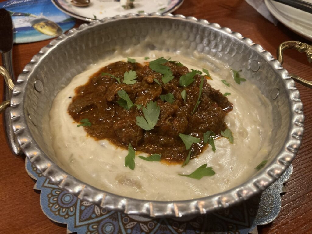 店主のなおもんさんの親友であるセマさんの家庭料理でよぉ、こちらは牛挽肉とポテトを組み合わせたケバブやちゃ。耐熱容器に入れてオーブンで焼いたケバブやちゃね。ハーブやスパイスが加わって、ちょっこし辛味があるのも特徴的やちゃ。肉の香ばしさがたまらなくて、シェヒリエピラウも進むがで、これはたまらんちゃ。